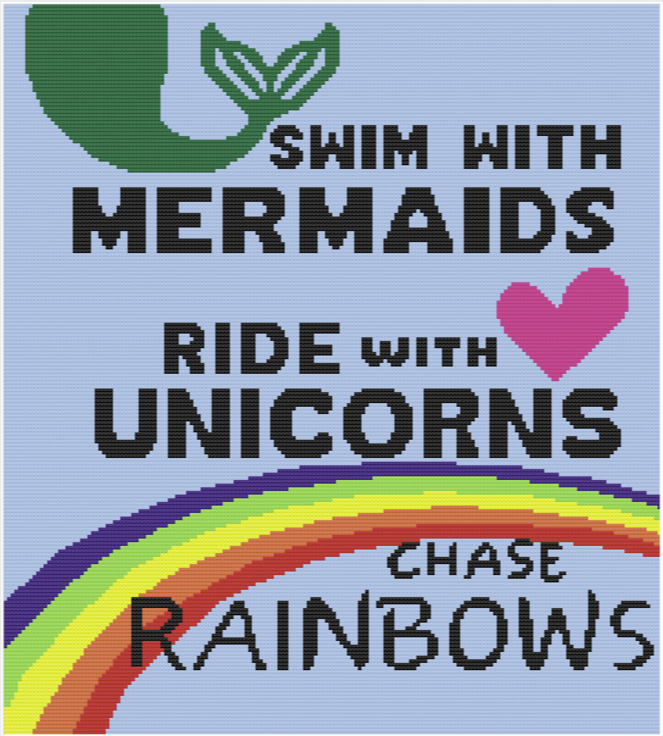 Example Swatch is 3” wide x 2 5/8” tall (7.5 cm x 7 cm) - a little more wide than tall. Mermaids, Unicorns, Rainbows – 180 x 200 APPROX. FINISHED SIZE 54 ” x 63” |