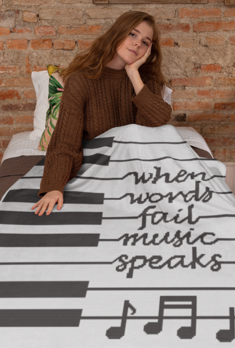 Example Swatch is 3 5/8” wide x 3 3/4” tall (9 cm x 9.5 cm) -almost the same width and height. MUSIC SPEAKS – 180x200 APPROX. FINISHED SIZE 65” x 75” |