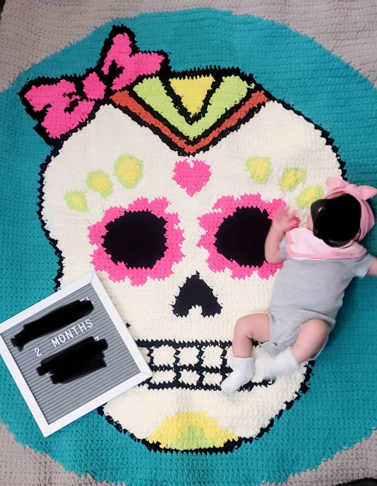 With an approximate gauge of 4 SC x 4 SC = 1” using an H hook, the finished size would be approximately 35”x47", which is the size of a Small Throw Blanket. The design could be made larger by adding more rows to the 4 edges or adding an additional border.